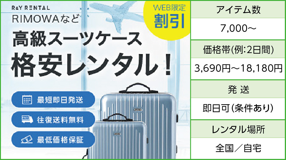 R&Y Rental(アールワイレンタル) 旅行関連 評価5.0 『日本最大級のスーツケースレンタル専門サイト』 POINT リモワ、サムソナイト、プロテカなど人気ブランドスーツケースが豊富で、在庫数7,000個以上 安心と信頼の取引実績・年間10万件以上 最低価格保証(ど […] 続きを読む